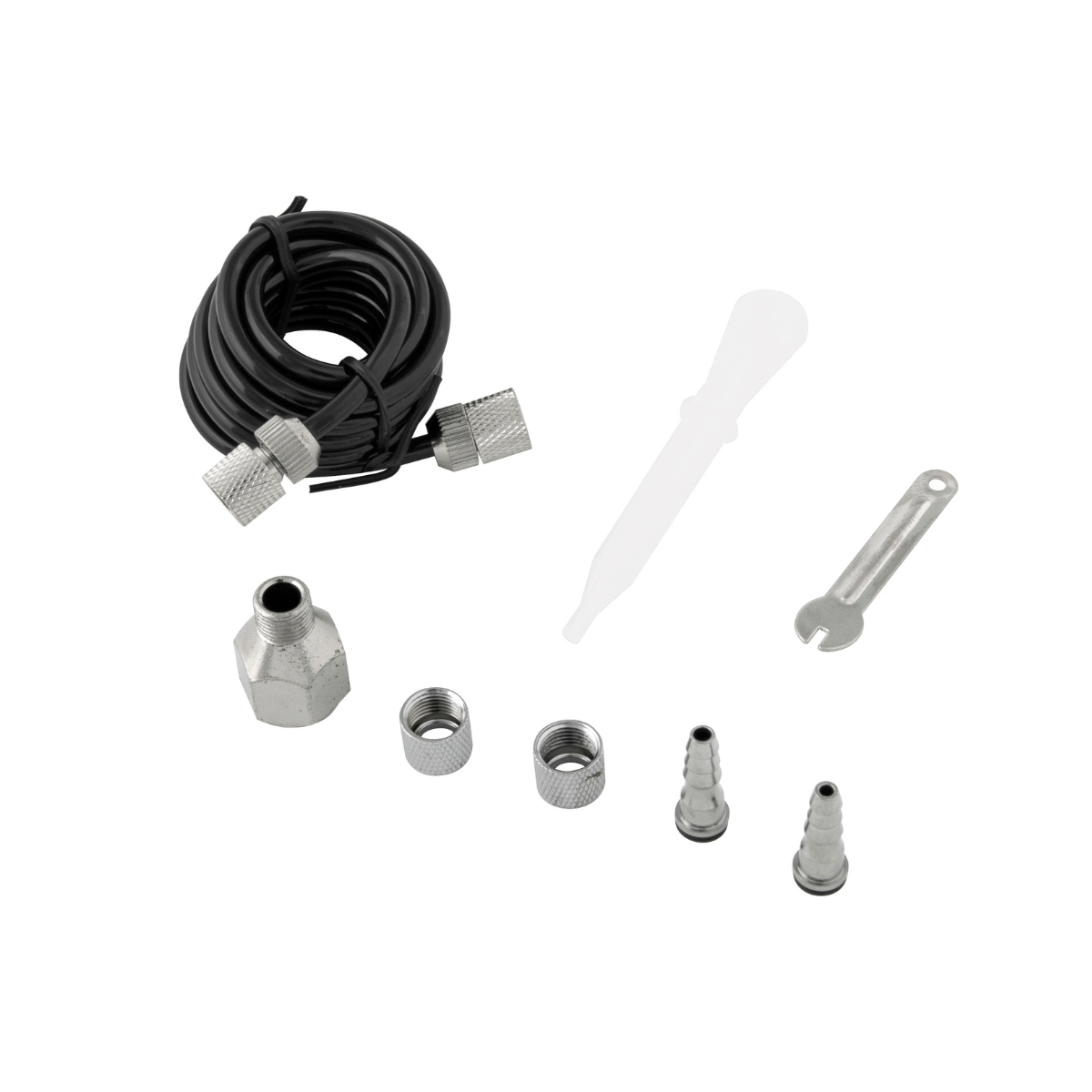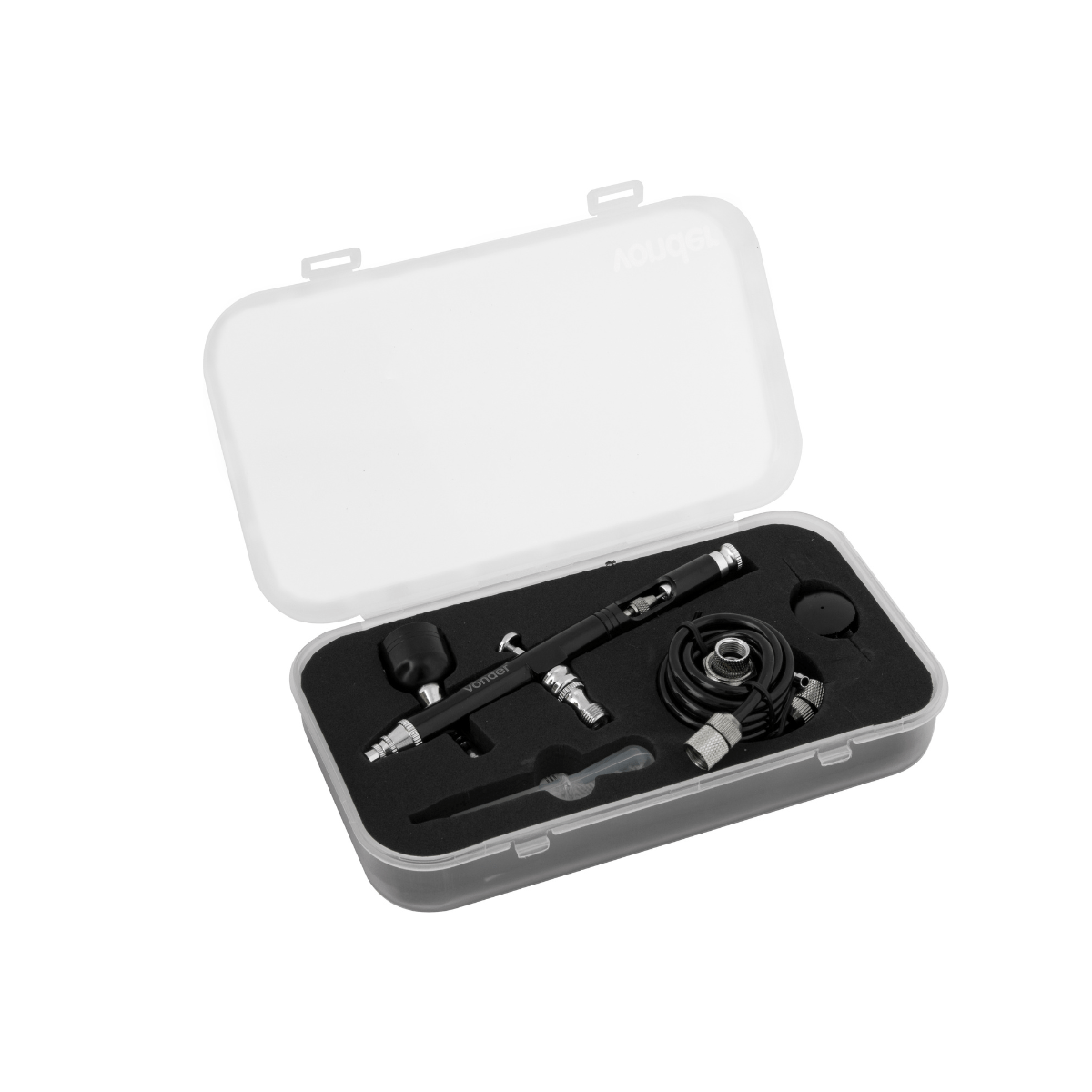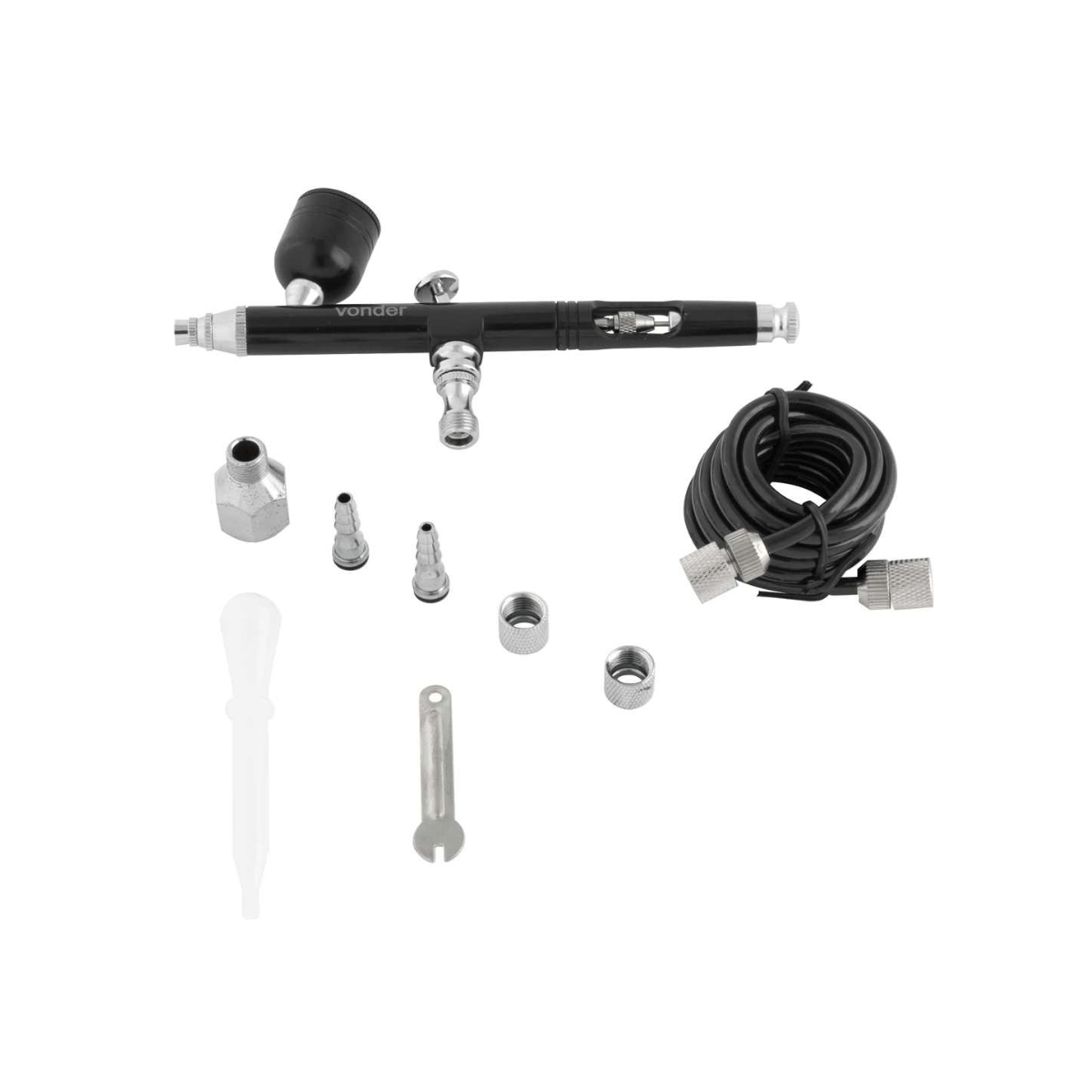 1 Aerógrafo com 7 acessórios, sendo: 1 pistola com caneca 7 ml e válvula de entrada, 1 adaptador 1/4 fêmea x 1/8 macho, 2 adaptadores 1/8 com espiga, 1 tubo de sucção, 1 chave e 1 mangueira de ar de 1,8 m.