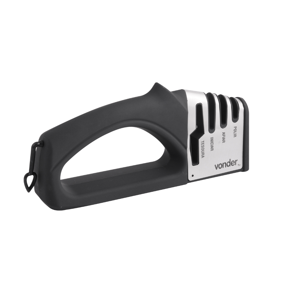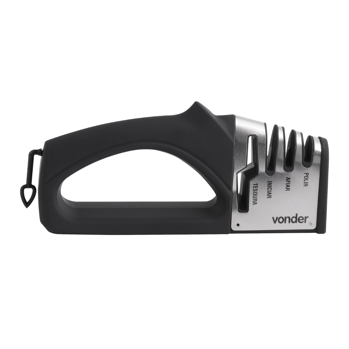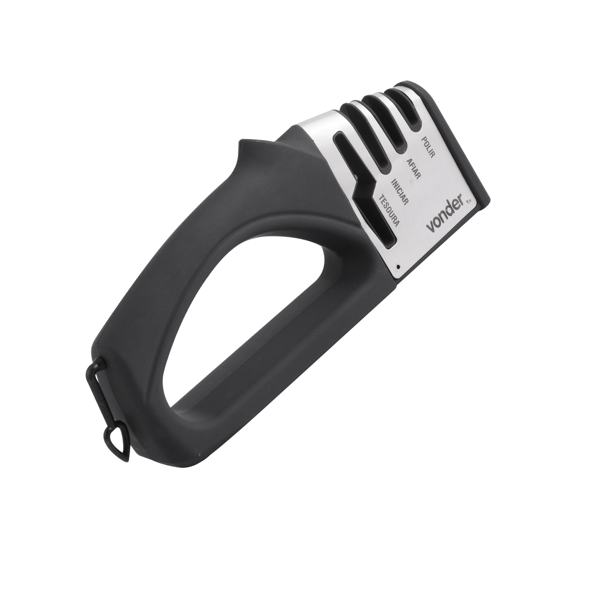 Afiador 2 em 1. Fácil de usar, possui alça estável e segura.