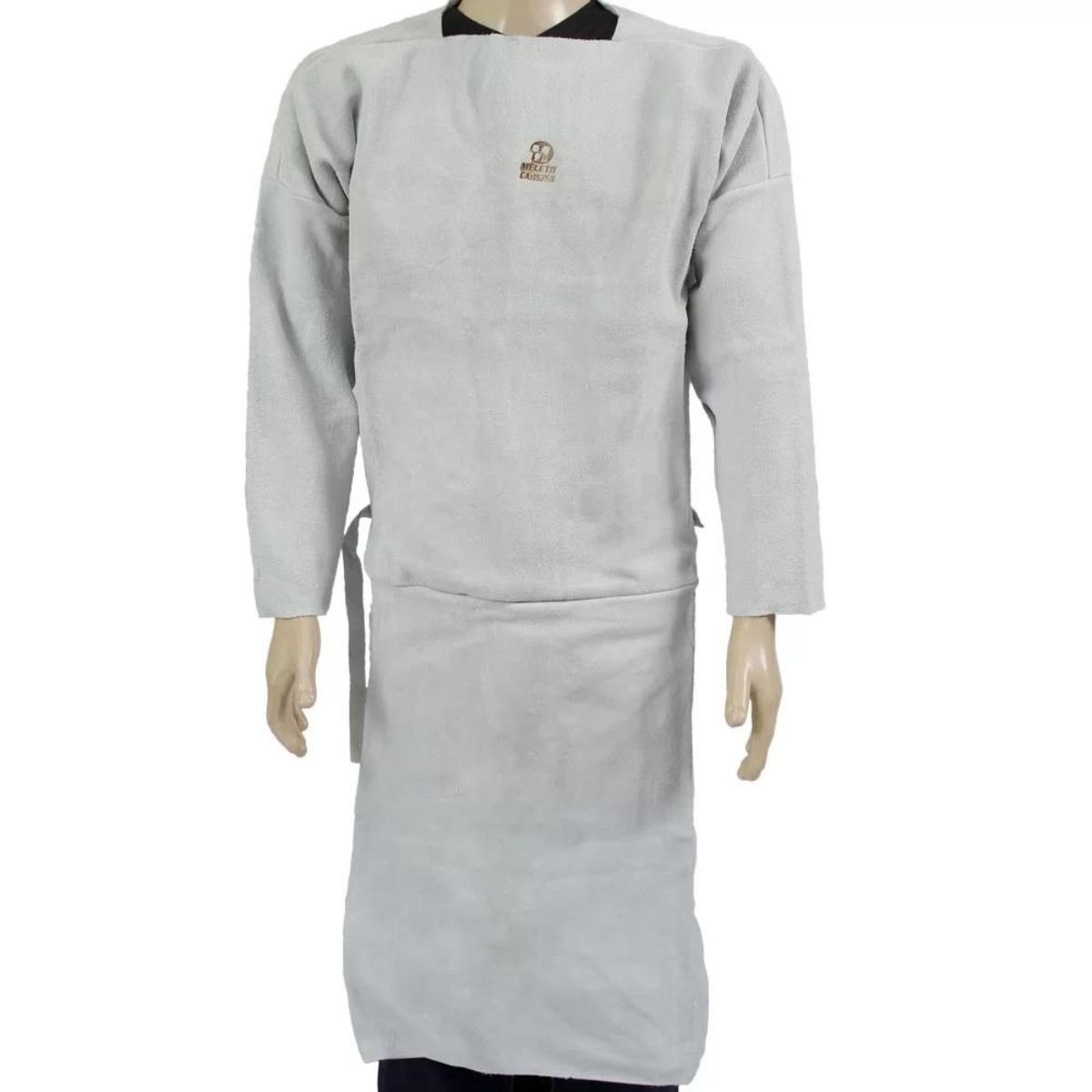Possui tiras laterais em raspa, indicadas para fixação e ajuste do avental, com elásticos de ajustes no cano da manga, proporcionando segurança e facilidade de uso.