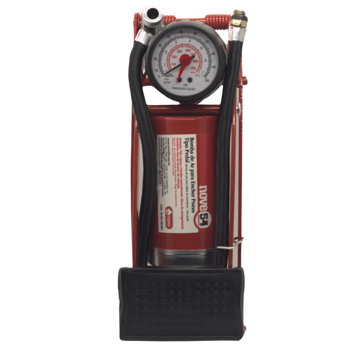 Indicada para encher pneus de carros, motos, bicicletas, infláveis, entre outros. Para o perfeito travamento do bico de enchimento da bomba, na válvula da câmara de ar ou bola, é necessário abaixar a alavanca do bico de enchimento.