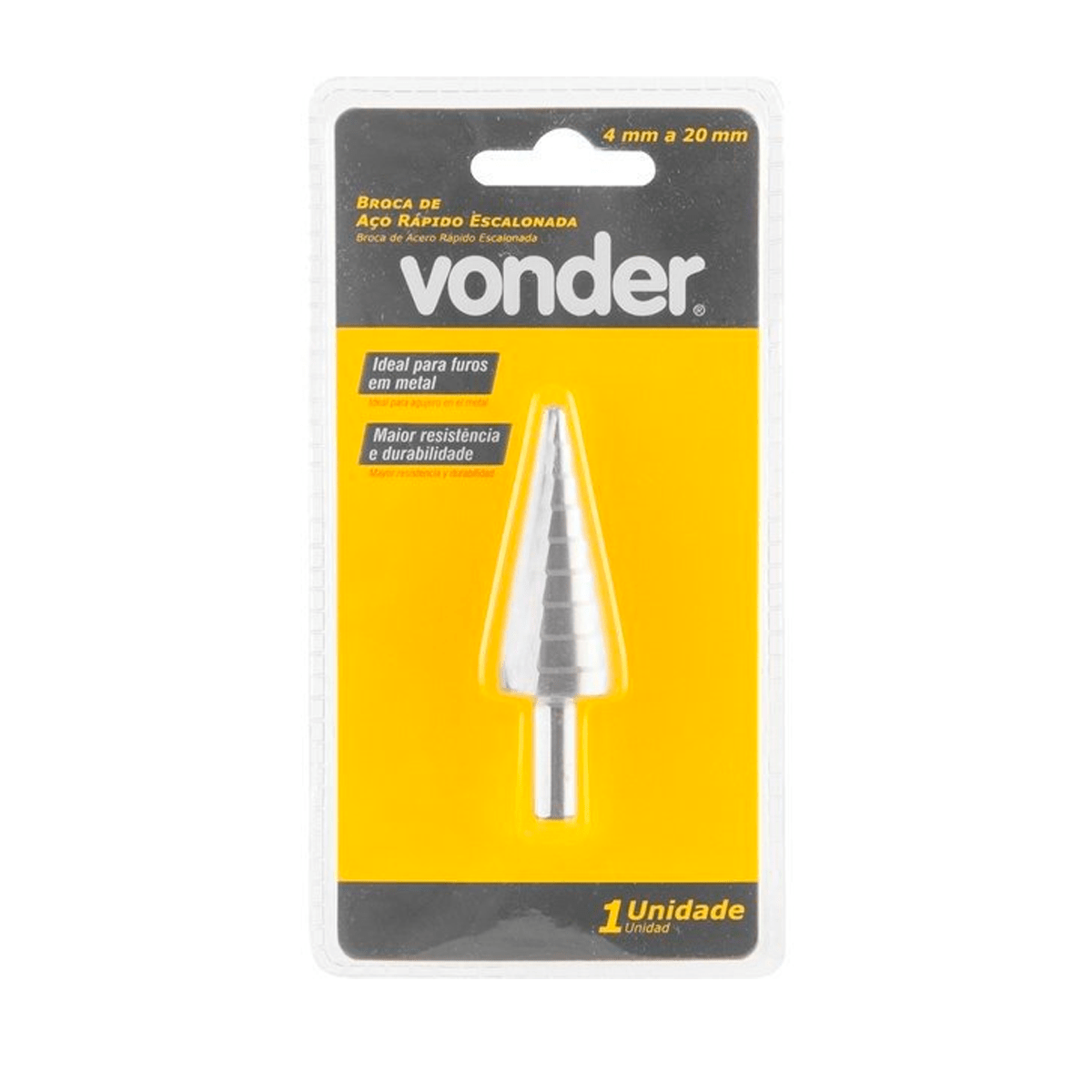 Permite obter diversos diâmetros com apenas uma broca, dispensando a necessidade de intercambiar a ferramenta. Produzida em aço rápido, proporcionando maior resistência e durabilidade.