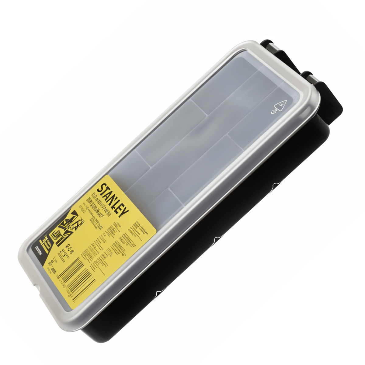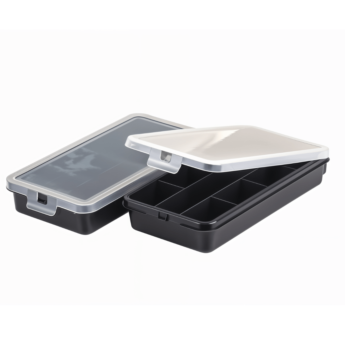 A caixa tem 9 compartimentos, tampa clara para fácil localização das partes armazenadas e fabricado com polipropileno resistente.