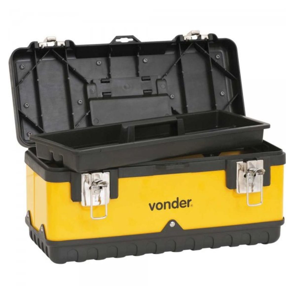 Possui partes em polipropileno, tampa com estrutura reforçada e bandeja plástica removível.