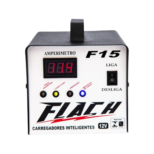 Pólo invertido: quando aceso indica ligação invertida dos cabos do carregador na bateria