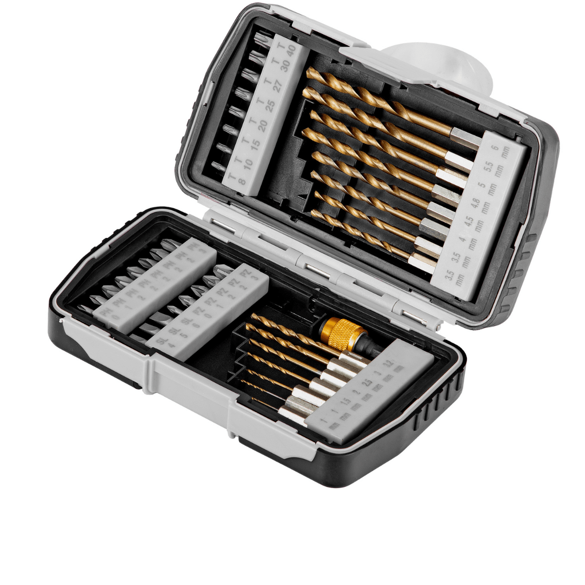 É perfeitamente adequado para uma ampla gama de tarefas, oferecendo 24 bits (PH e PZ nº 0-3, SL nº 4-6, T nº 8, 10, 15, 20, 25, 27, 30, 40) e 15 brocas com diâmetros de 1 a 6 mm, destinados à montagem de parafusos e autoperfurantes, bem como à perfuração em metal.