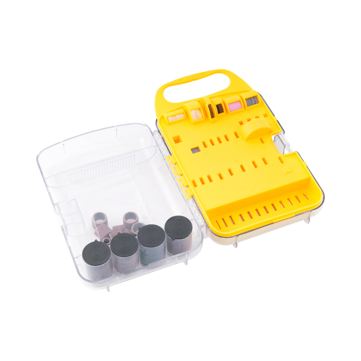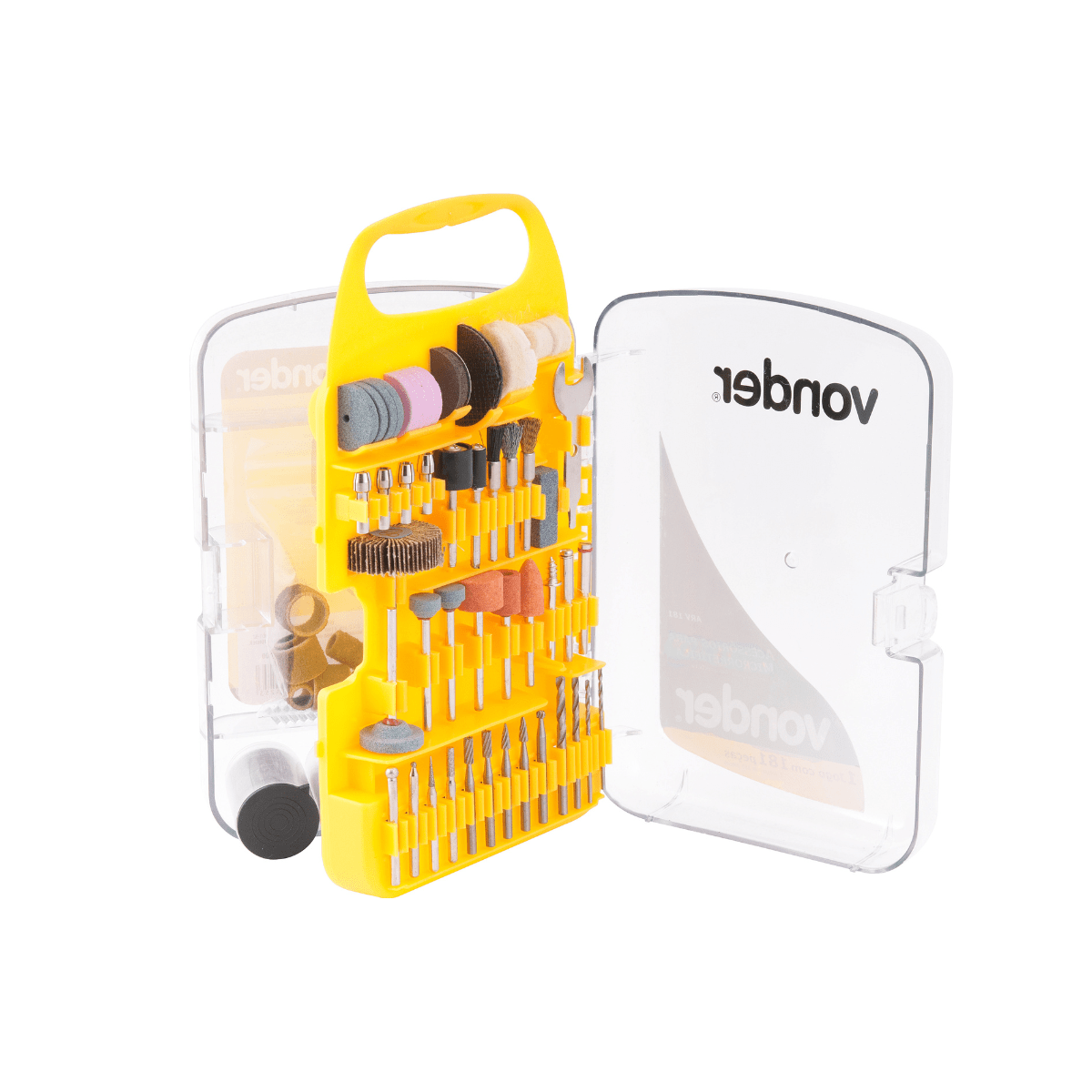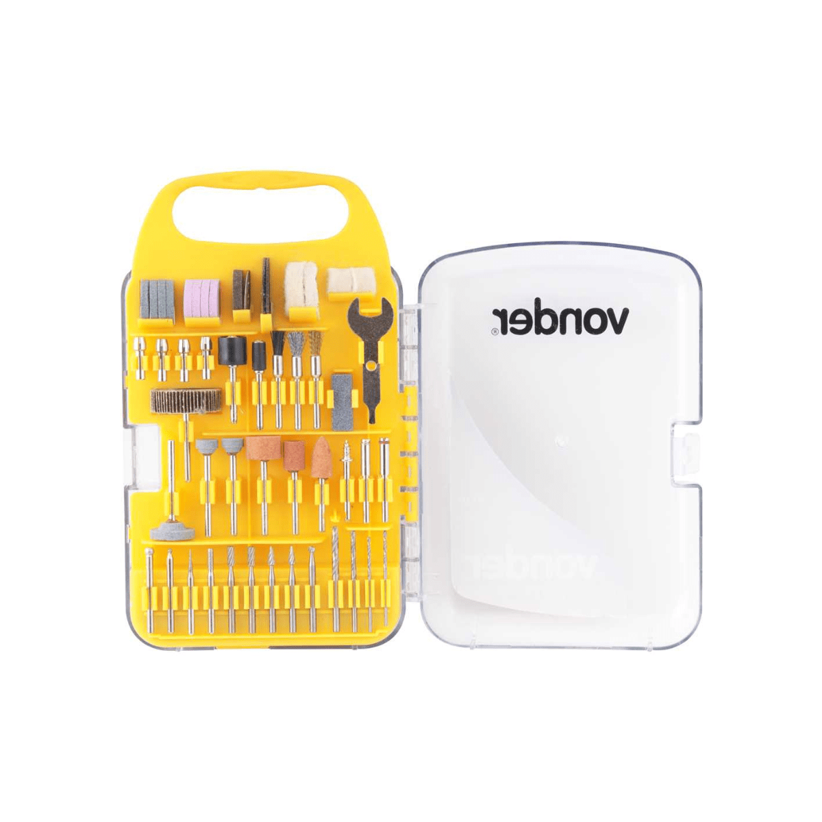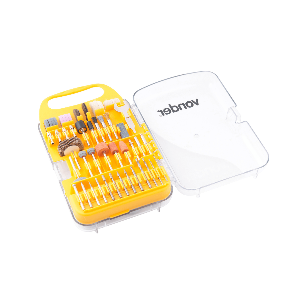 1 disco diamantado, 4 rebolos de carbureto de silício, 3 pontas montadas de carbureto de silício, 4 limas rotativas diamantadas, 1 escova de inox, 1 escova de latão, 1 escova de nylon, 4 pinças (1 - 1/16, 1 - 3/32, 2 - 1/8), 1 chave para microrretífica, 9 limas rotativas diamantadas, 1 haste para disco de corte, 1 haste para roda de pano, 1 haste para disco de feltro, 2 discos de feltro pequenos, 1 pasta para polimento, 1 disco de feltro grande, 1 roda de pano, 5 lixas cilíndricas pequenas, 5 lixas cilíndricas grandes, 1 roda de borracha, 4 rebolos de óxido de alumínio, 3 pontas montadas de óxido de alumínio, 1 haste para lixas cilíndricas pequena, 1 haste para lixas cilíndricas grande, 44 discos de lixa, 30 discos de corte 0,8 mm, 46 discos de corte 0,4 mm, 1 bastão abrasivo, 1 roda de lixa (grão 80) e 2 discos de corte de fibra de vidro.