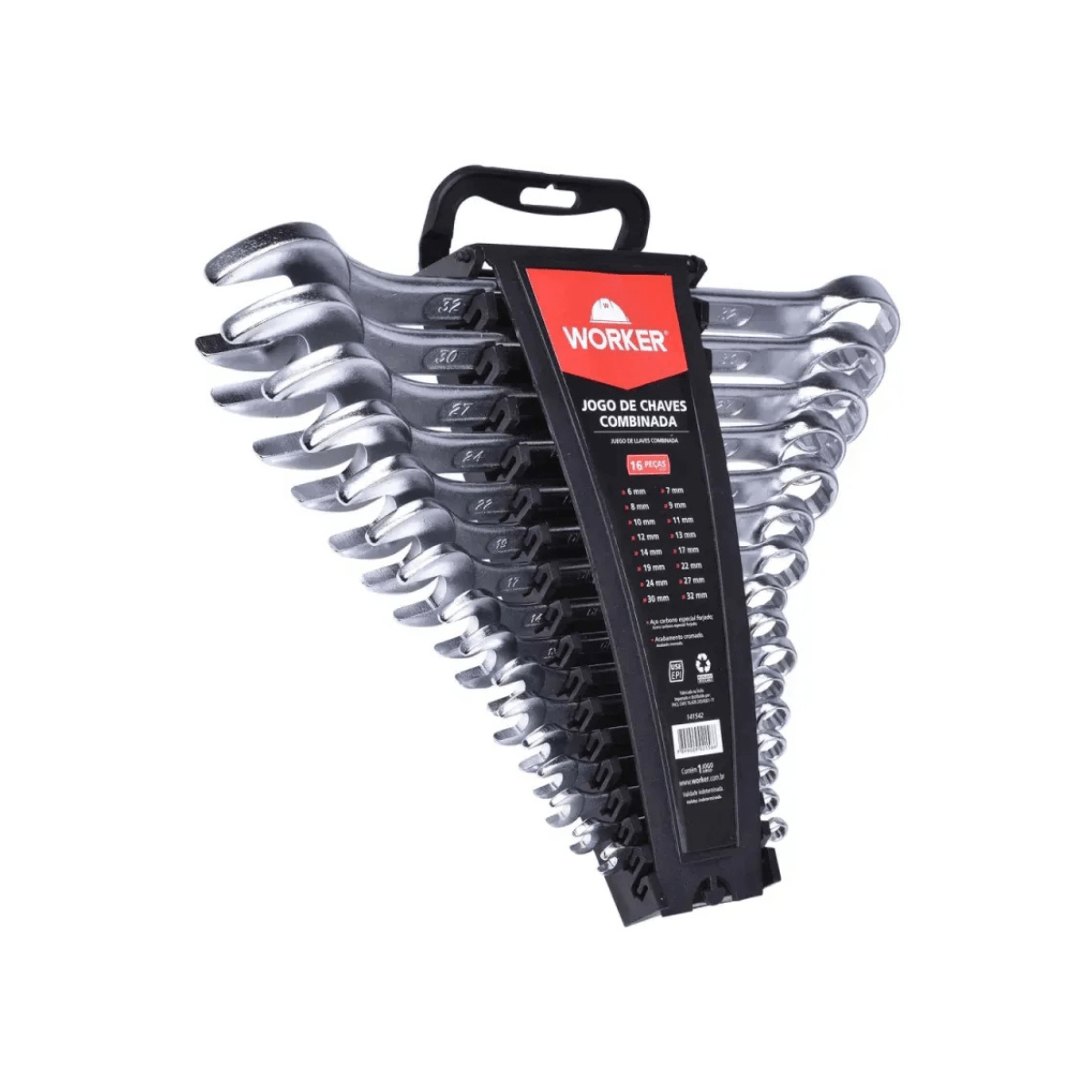 Projetado para desempenho máximo, o Conjunto de Chaves Combinadas Worker oferece 16 peças de diferentes tamanhos, de 6mm a 32mm, cobrindo uma ampla gama de necessidades.