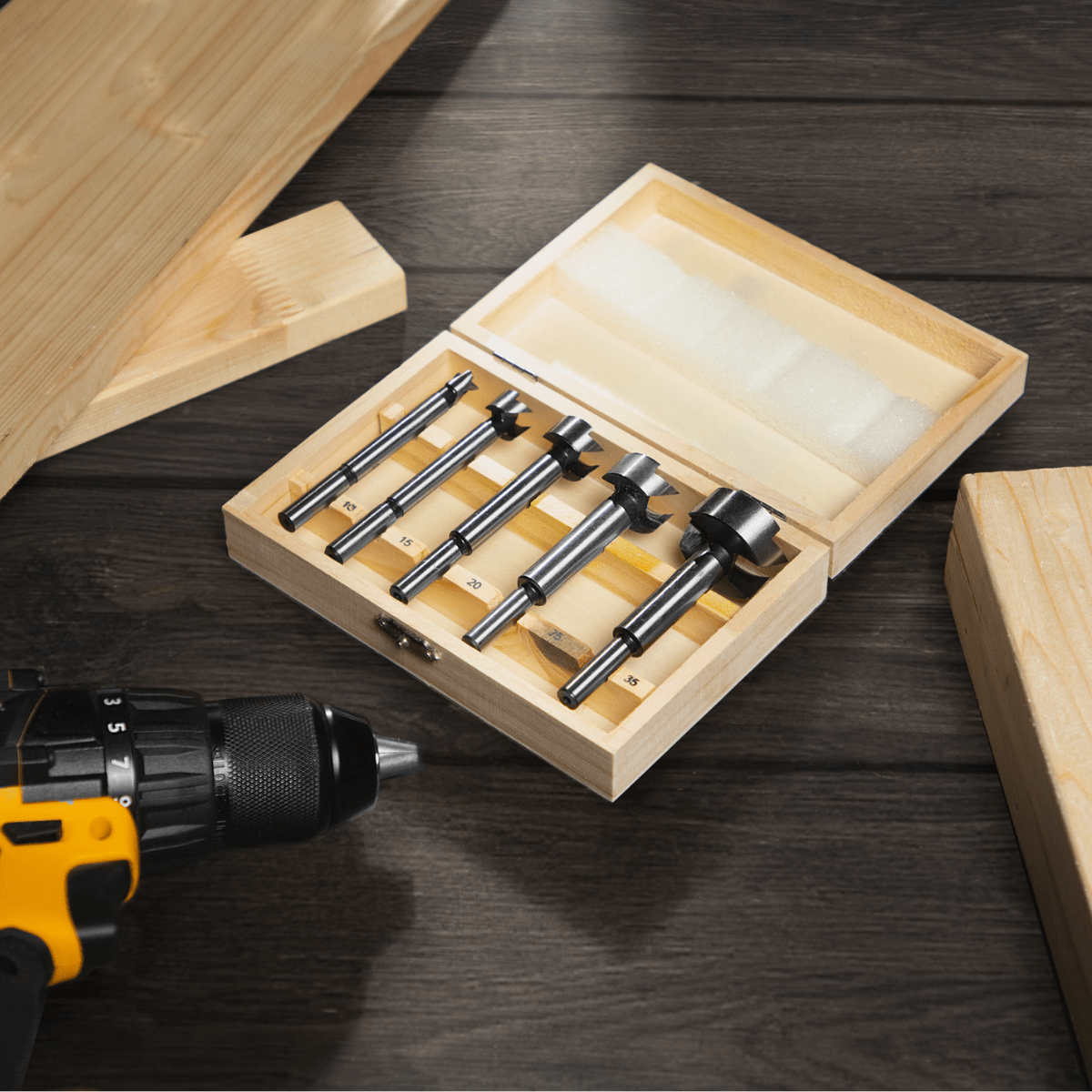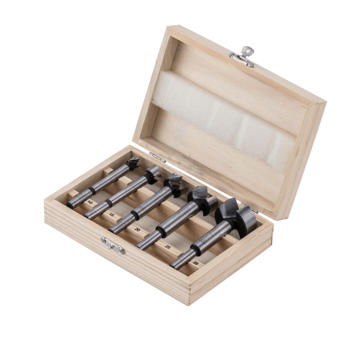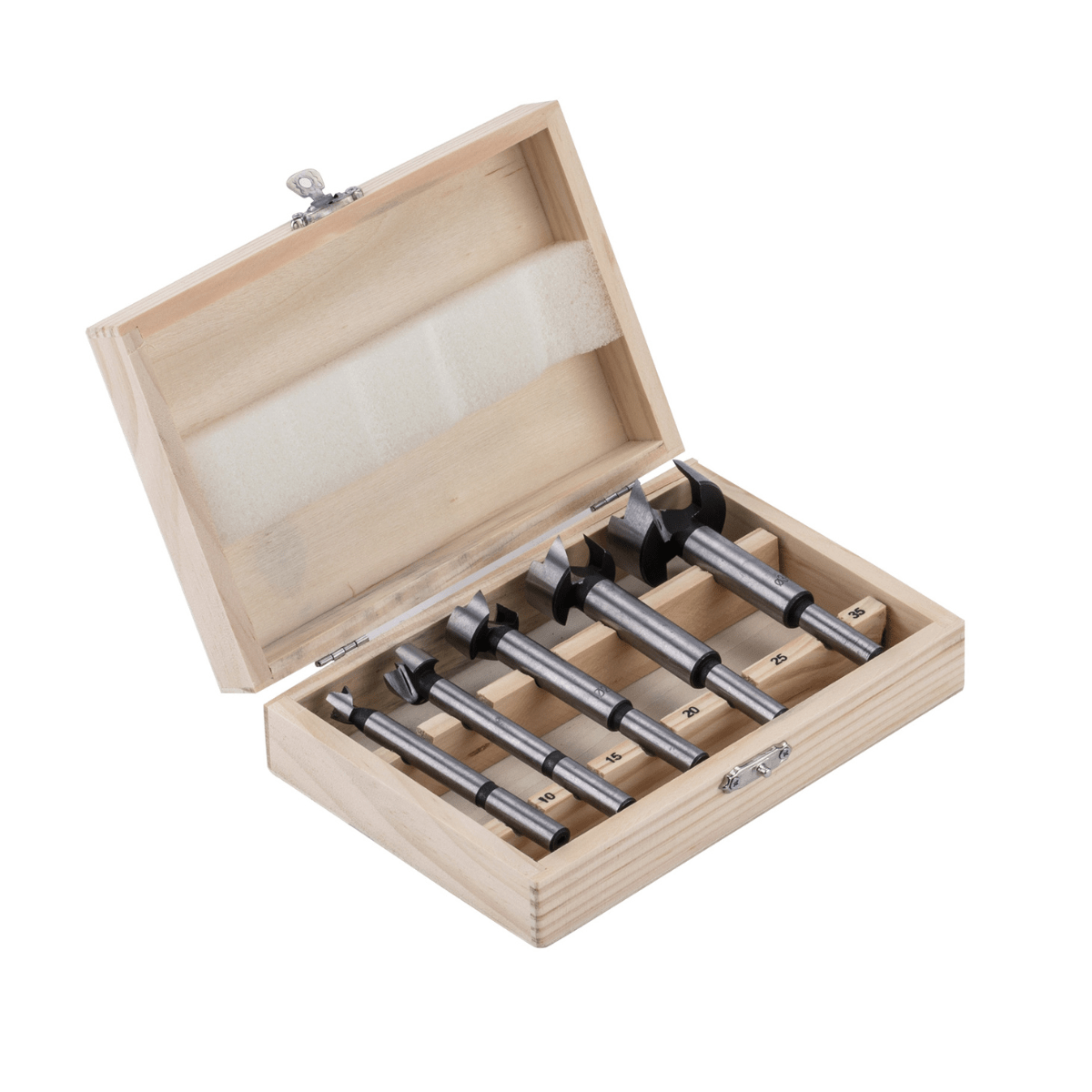 Este conjunto inclui 5 brocas Forstner nos tamanhos de 10, 15, 20, 25 e 35 mm, todas com hastes cilíndricas e acomodadas em uma elegante e resistente caixa de madeira. As brocas Forstner são conhecidas por sua capacidade de criar furos com bordas e fundos extremamente lisos em uma variedade de materiais, como madeira, MDF (Medium-Density Fiberboard) e DSP (Painel de Partículas de Densidade Média), sendo ideais para a instalação de fechaduras, dobradiças de porta e guarnições.