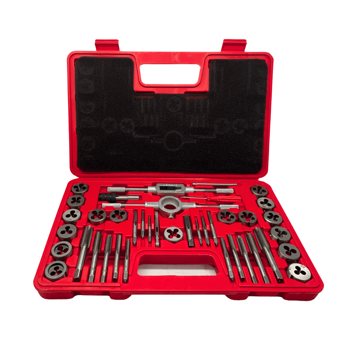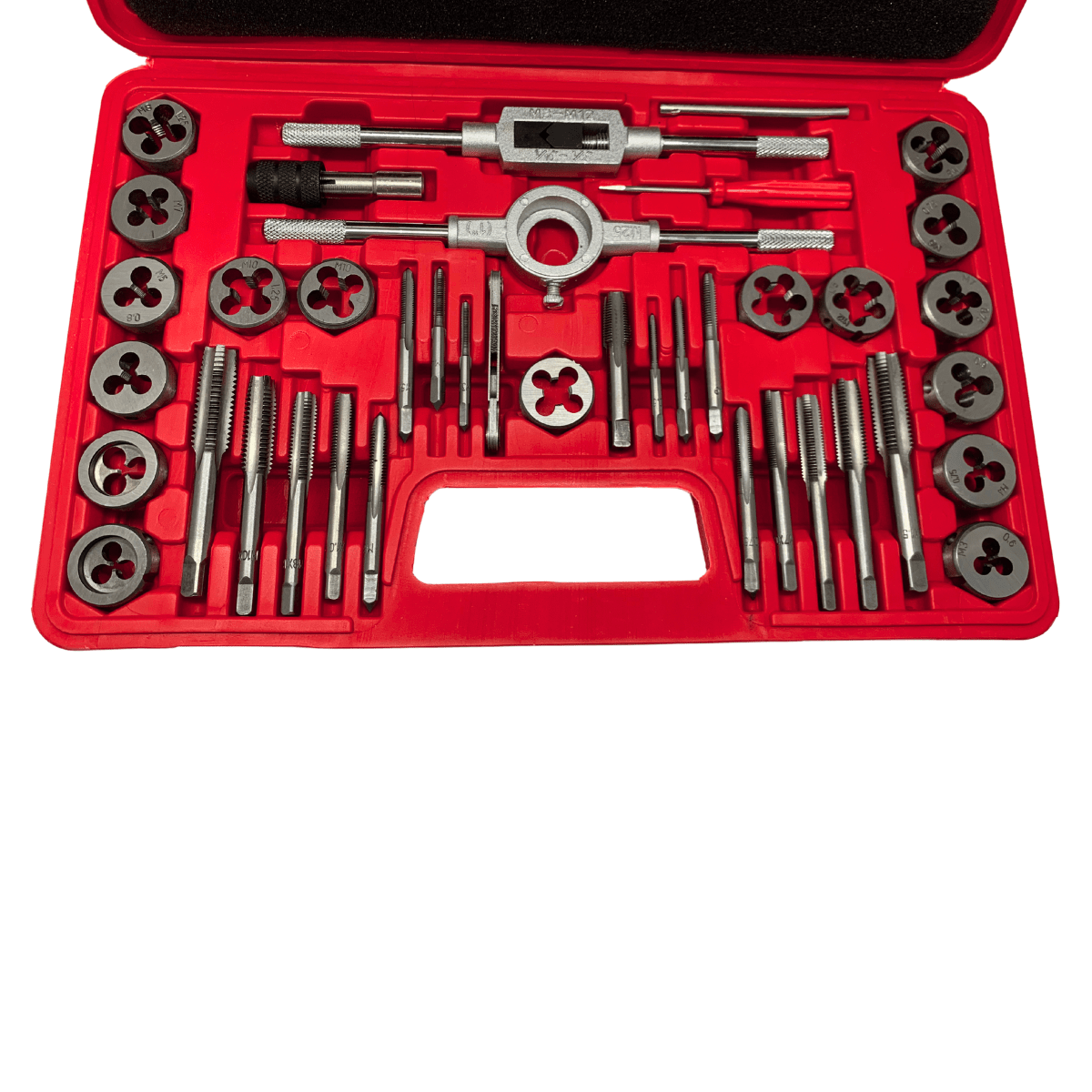 Este conjunto completo inclui machos e tarraxas em medidas variadas, além de acessórios essenciais como cabos, suporte e medidor de rosca, tudo organizado em um estojo resistente e prático para transporte e armazenamento.