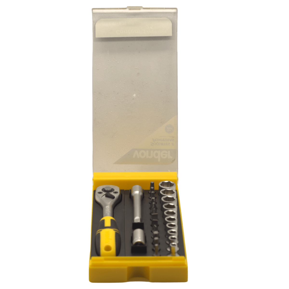 1 Jogo de soquetes e ponteiras composto por 25 peças, sendo: 1 catraca 1/4, 1 extensão 1/4 x 75,0 mm, 1 adaptador 1/4, soquetes sextavado 1/4 (4,0 mm, 5,0 mm, 6,0 mm, 7,0 mm, 8,0 mm, 9,0 mm, 10,0 mm, 11,0 mm, 12,0 mm, 13,0 mm), bits sextavado (3,0 mm, 4,0 mm, 5,0 mm), bits fenda (4,0 mm, 5,0 mm, 6,0 mm), bits phillips (PH1, PH2, PH3), bits hexalobular (T15, T20, T25). Acompanha estojo plástico.