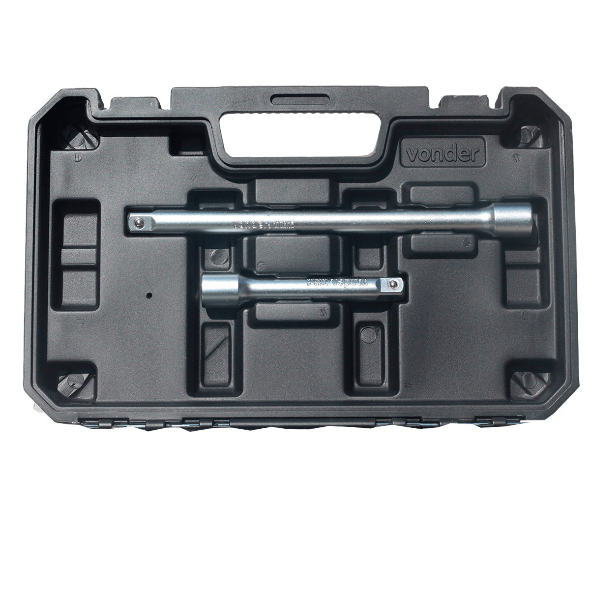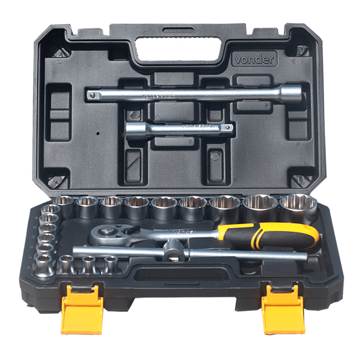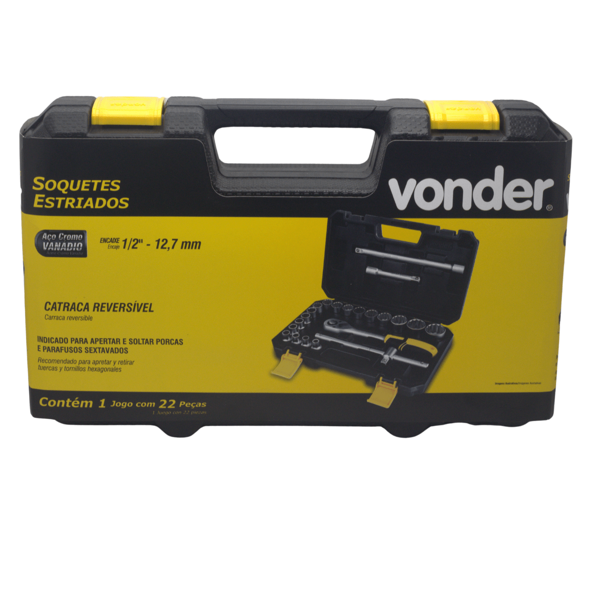 1 Jogo de soquetes, composto por 1 maleta plástica com 22 peças, sendo: 18 soquetes estriados (8 mm, 9 mm, 10 mm, 11 mm, 12 mm, 13 mm, 14 mm, 15 mm, 16 mm, 17 mm, 18 mm, 19 mm, 21 mm, 22 mm, 24 mm, 27 mm, 30 mm e 32 mm), 1 catraca reversível, 1 cabo T, 1 extensão 5 e 1 extensão 10.