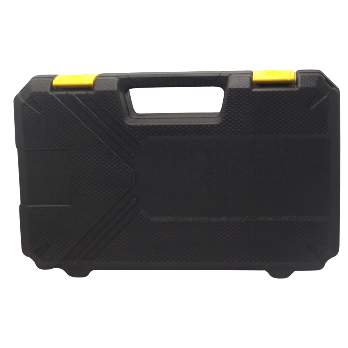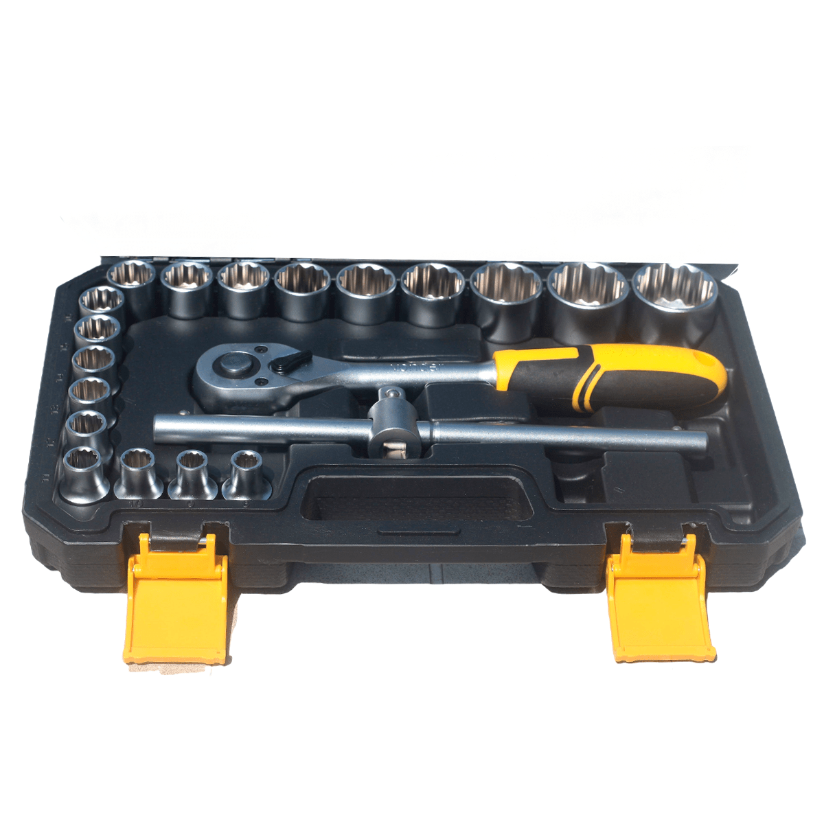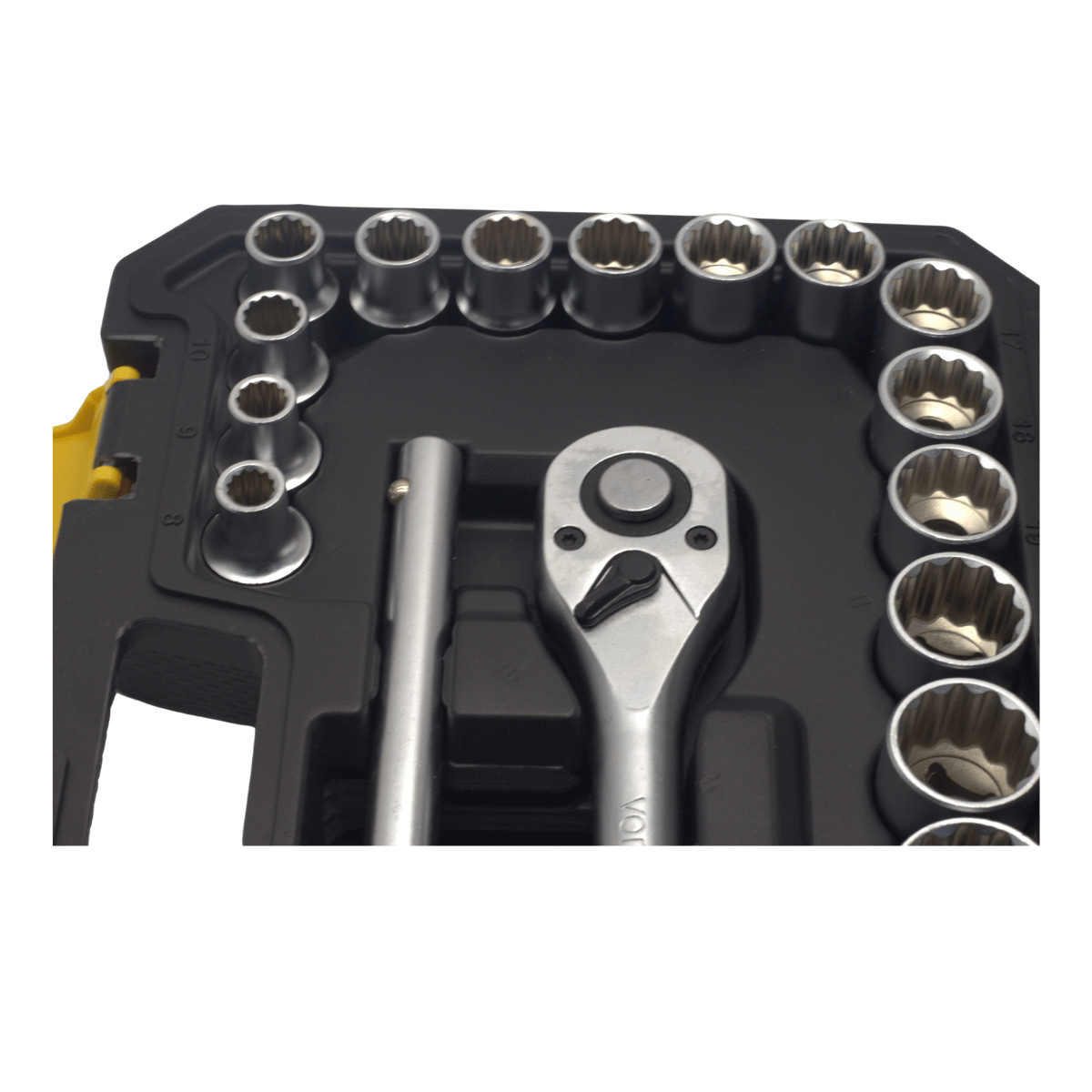 1 Jogo de soquetes, composto por 1 maleta plástica com 22 peças, sendo: 18 soquetes estriados (8 mm, 9 mm, 10 mm, 11 mm, 12 mm, 13 mm, 14 mm, 15 mm, 16 mm, 17 mm, 18 mm, 19 mm, 21 mm, 22 mm, 24 mm, 27 mm, 30 mm e 32 mm), 1 catraca reversível, 1 cabo T, 1 extensão 5 e 1 extensão 10.