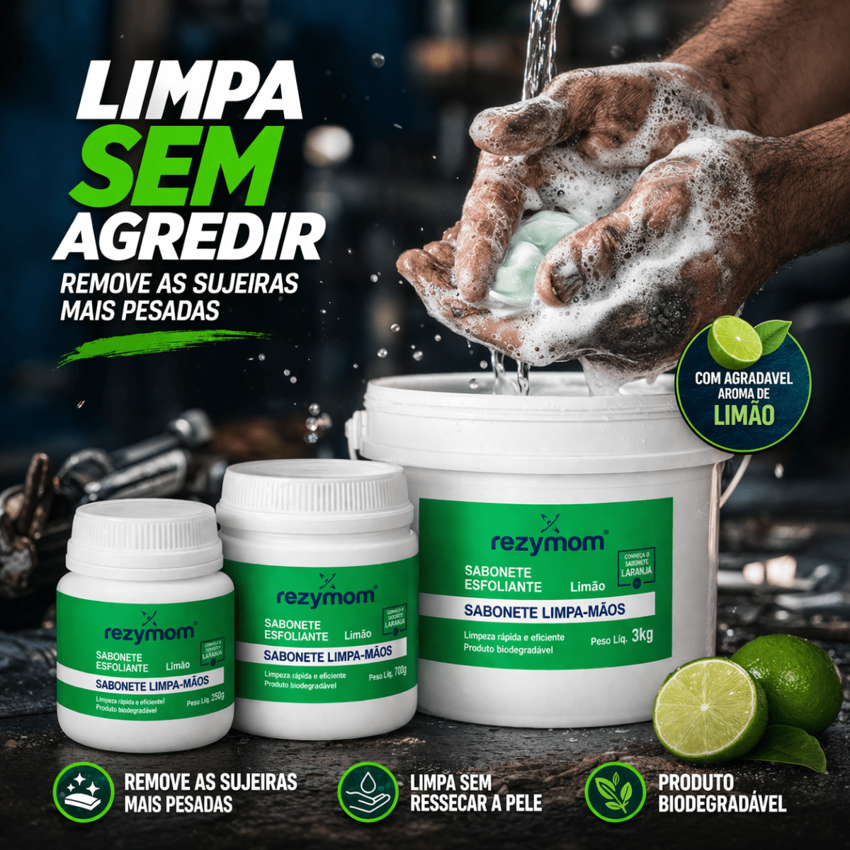 O Sabonete Esfoliante Limpa-mãos Rezymom Limão possui matérias-primas diferenciadas e o novo perfume de limão traz uma sensação de frescor. A eficiência na limpeza é a mesma, com redução nos custos. Remove as sujeiras mais pesadas, como colas, tintas gráficas, resina de pinus, graxas, entre outras.