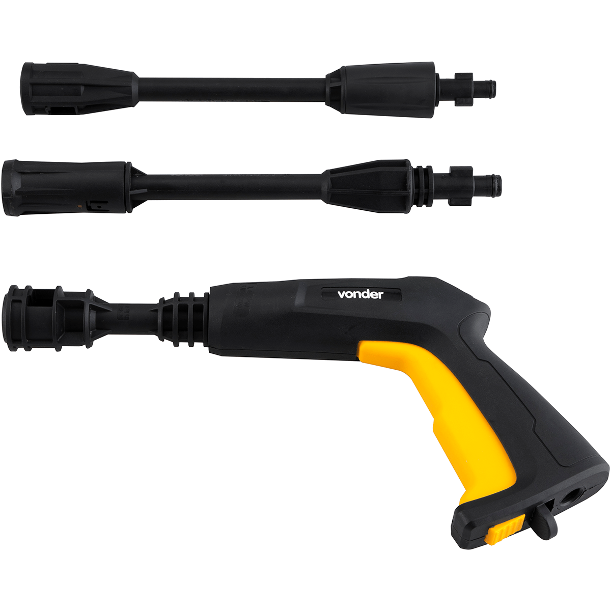 1 Lavadora de alta pressão. Acompanha: 1 acessório para detergente, 1 mangueira de alta pressão com 3 m, 1 lança com bico ajustável, 1 pistola com gatilho e 1 conector engate rápido de 1/2 com filtro interno lavável.