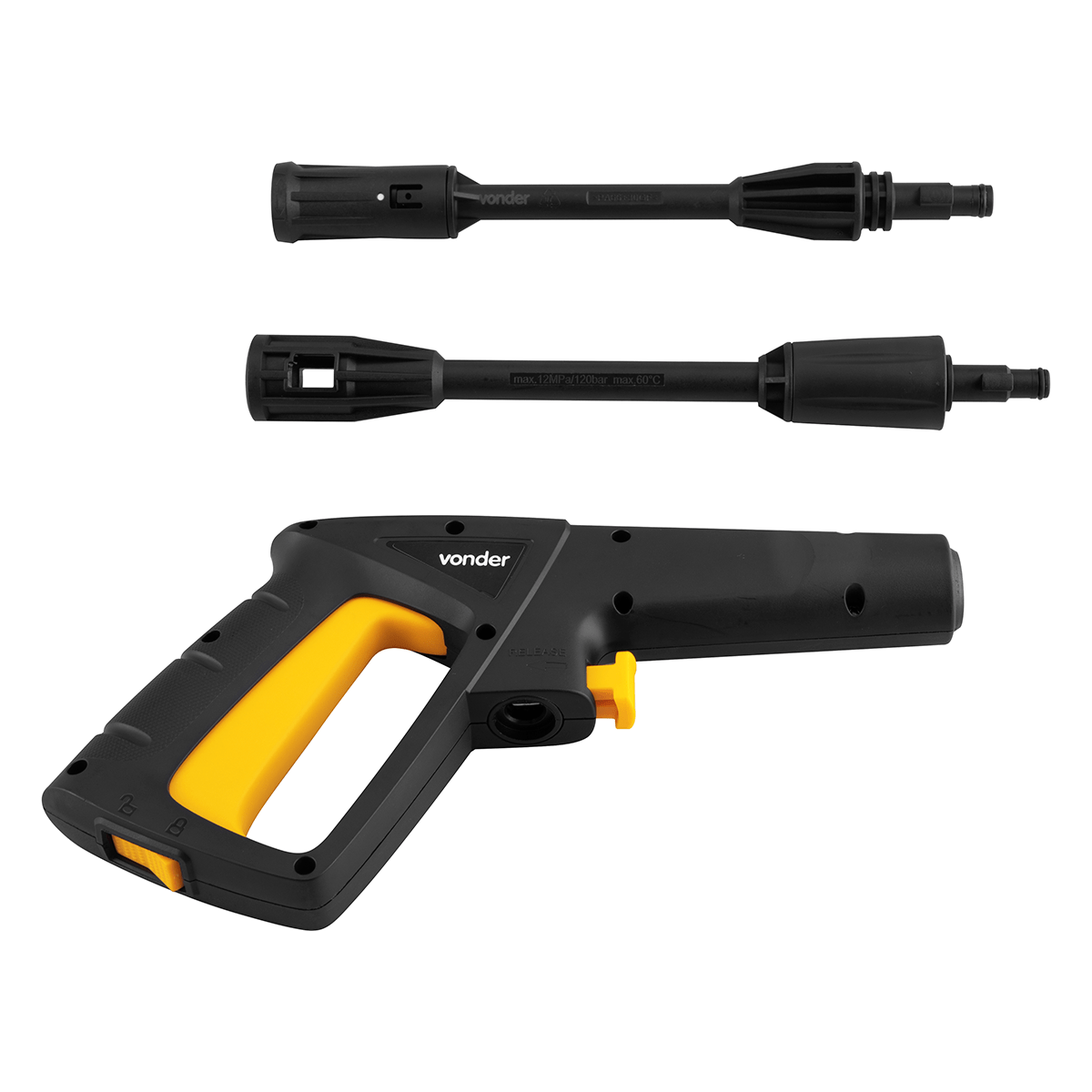 1 Lavadora de alta pressão. Acompanha: 1 acessório para detergente, 1 mangueira de alta pressão com 5 m, 1 lança com bico ajustável, 1 pistola com gatilho e 1 conector engate rápido de 1/2 com filtro interno lavável.