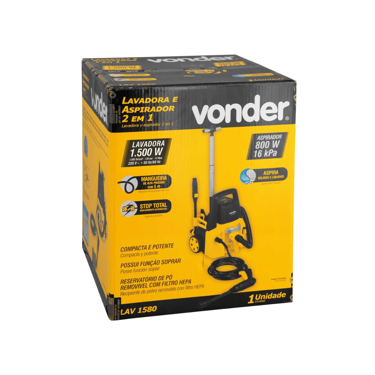 Acompanha: 1 pistola com gatilho, 1 lança, 1 bico ajustável, 1 bico turbo, 1 mangueira de alta pressão 5 m, 1 mangueira de aspiração, 1 bocal escova multiuso e 1 bocal para cantos.