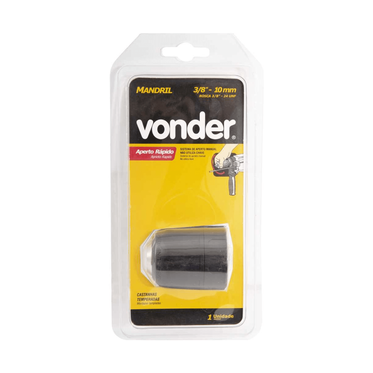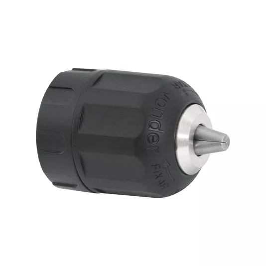 Dispensa a utilização da chave para mandril, facilitando o trabalho do operador, que coloca e retira o acessório do equipamento utilizando apenas as mãos sem uso de chaves.