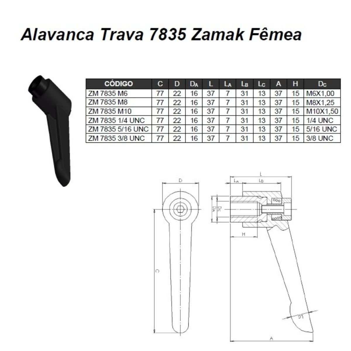 Manipulo Alavanca Trava Fêmea M8 - Ma 1,25 Zamak 7835Cor: 1 Pç | Tamanho: M8 | Quant: 2x