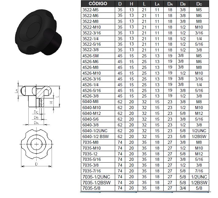 Aplicacoes: Maquinas, equipamento e dispositivos que requerem regulagem manual, e/ou fixacao das partes moveis.