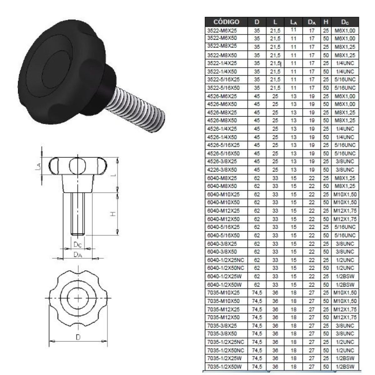 Manipulo Femea M8 - 1,25 - 4526 Modelo MargaridaCor: 1 Pç | Tamanho: M8 | Quant: 16xManipulo Macho M8 X 50mm - 4526 Rosca Ma 8 -1,25 Modelo MargaridaCor: 1 Pç | Tamanho: M8X50 | Quant: 26x