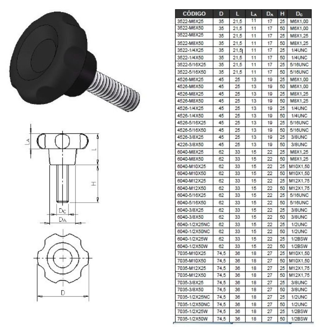 Aplicacoes: Maquinas, equipamento e dispositivos que requerem regulagem manual, e/ou fixacao das partes moveis.