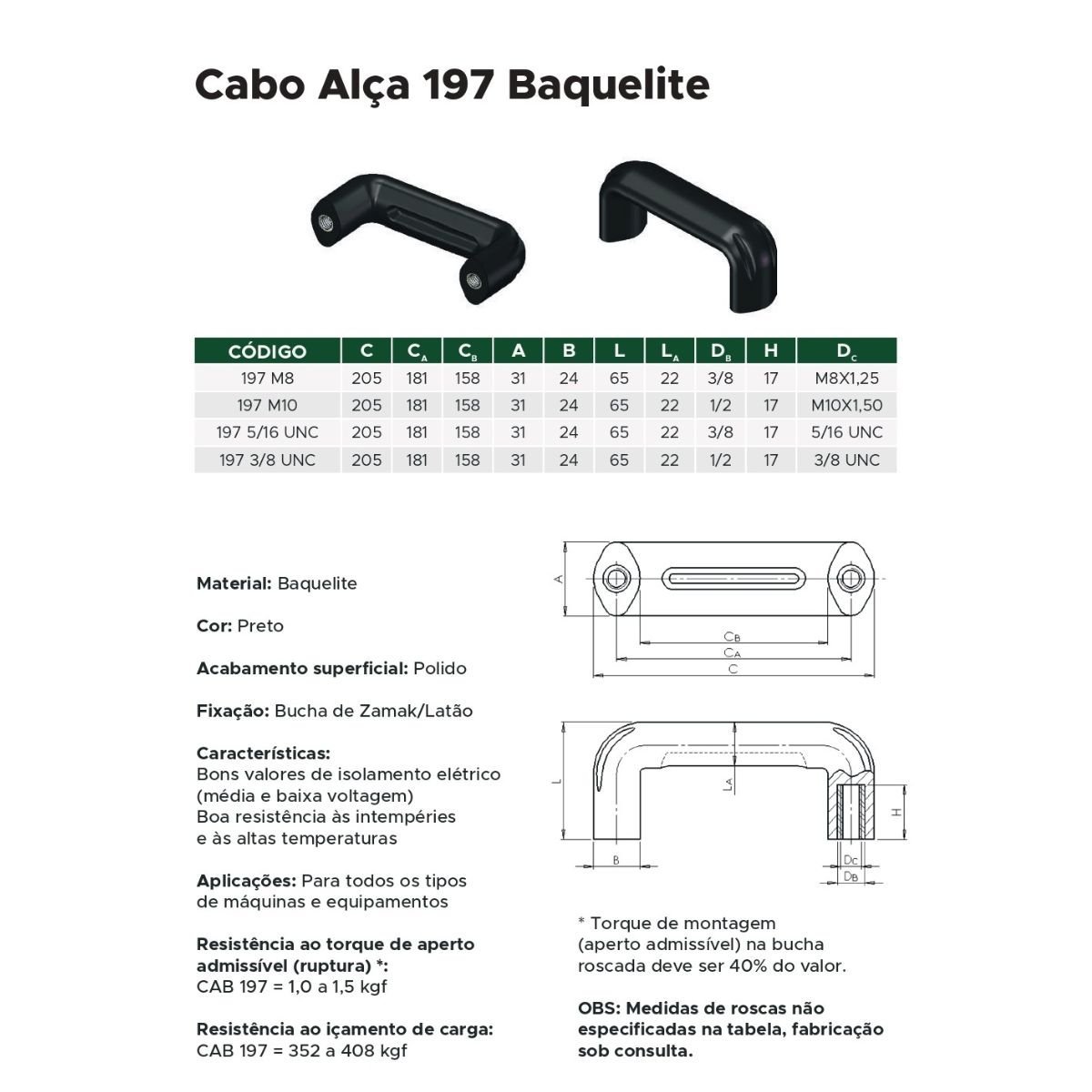 O cabo alça 197 é produzido em Baquelite e tem sua fixação em bucha de zamak ou latão. Com acabamento polido e exclusivamente na cor preta, tem bom isolamento elétrico e resistência as altas temperaturas.