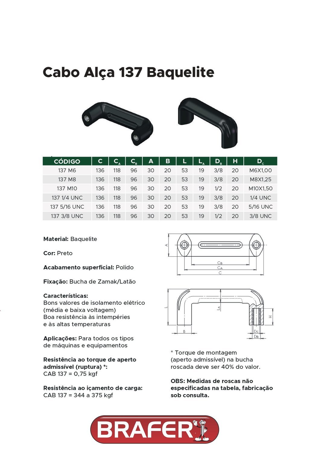 O cabo alça 137 é produzido em Baquelite e tem sua fixação em bucha de zamak ou latão. Com acabamento polido e exclusivamente na cor preta, tem bom isolamento elétrico e resistência as altas temperaturas.