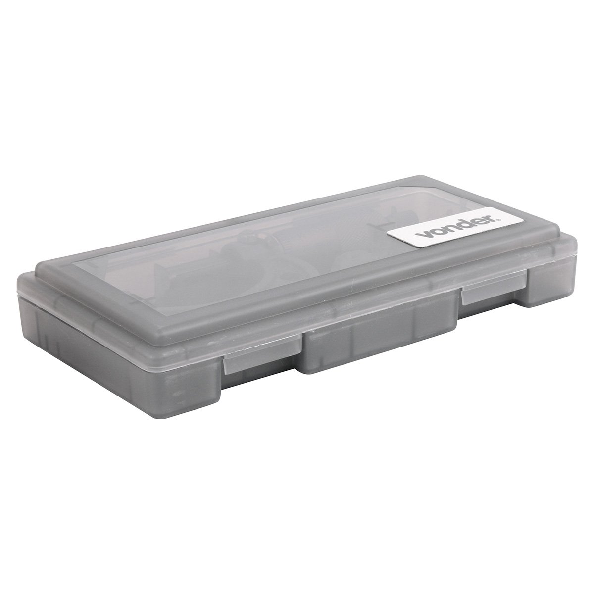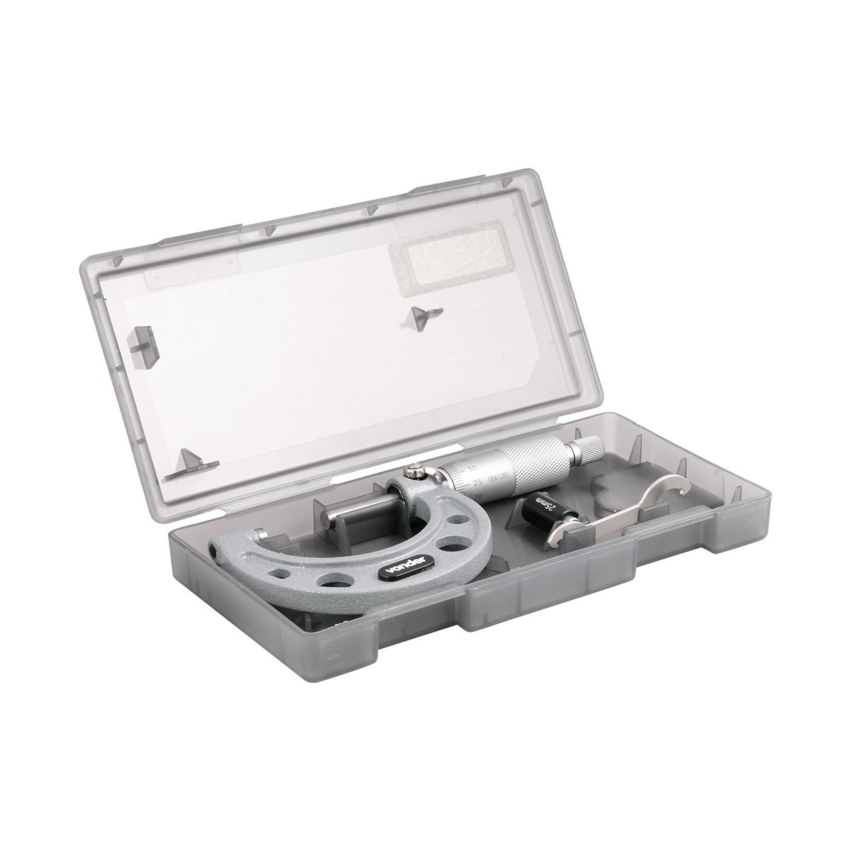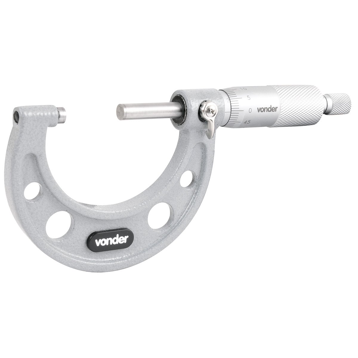 Possui faces de medição em metal duro, arco de ferro fundido esmaltado e catraca para força de medição constante.