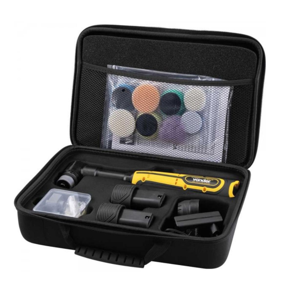 Acompanha: 1 maleta com 2 baterias 12V - 2Ah íons de lítio e 1 fonte para carregamento 100 V~ a 240 V~ bivolt automática. 1 adaptador rotativo orbital, 1 adaptador roto-orbital leve, 1 adaptador roto-orbital pesado, 1 disco fixa fácil, 1 protetor do disco, 2 chaves especiais e 8 acessórios para polimento.