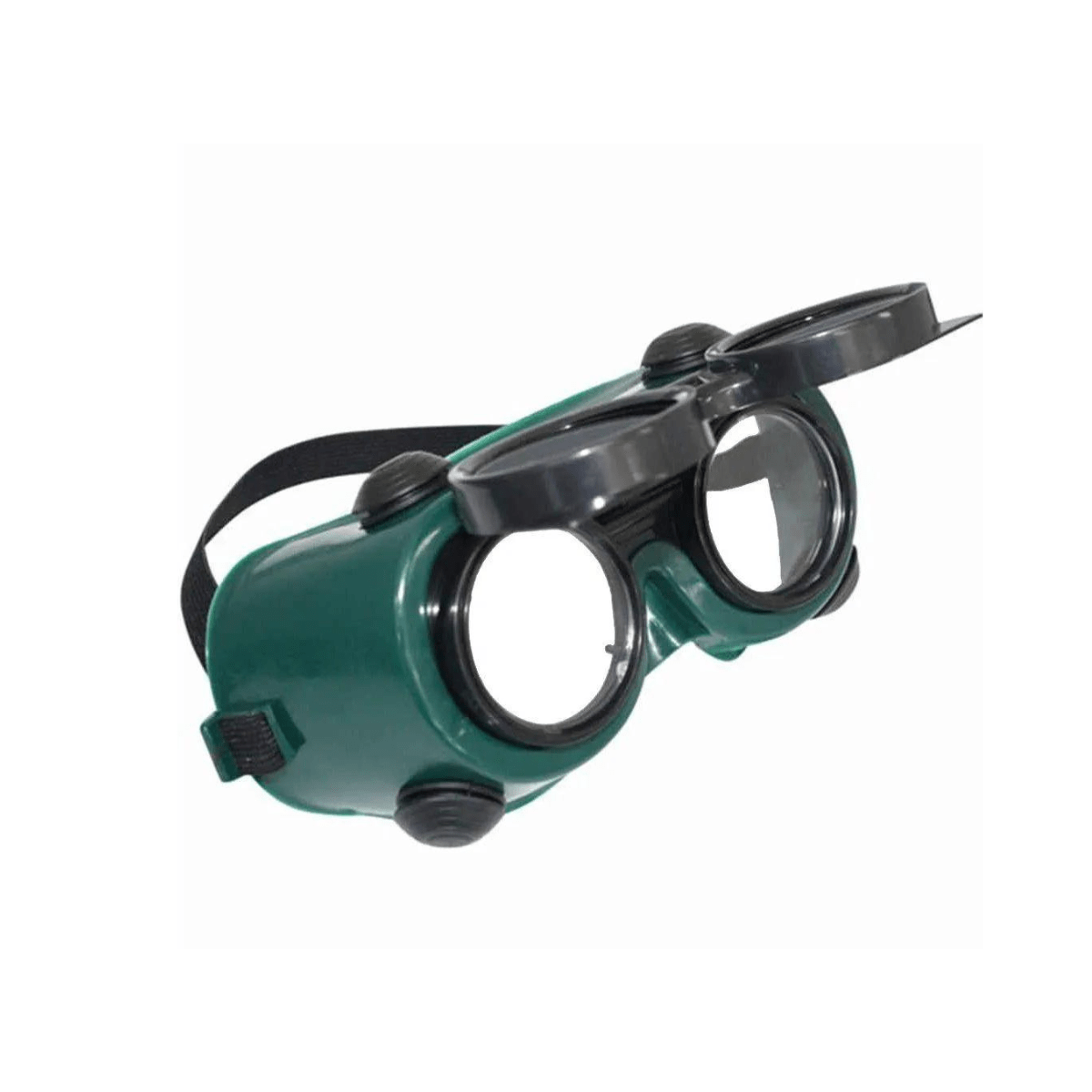 A armação cobre toda a região em torno dos olhos. Possui filtro de luz verde de tonalidade W5 e lente de proteção incolor com proteção UV.