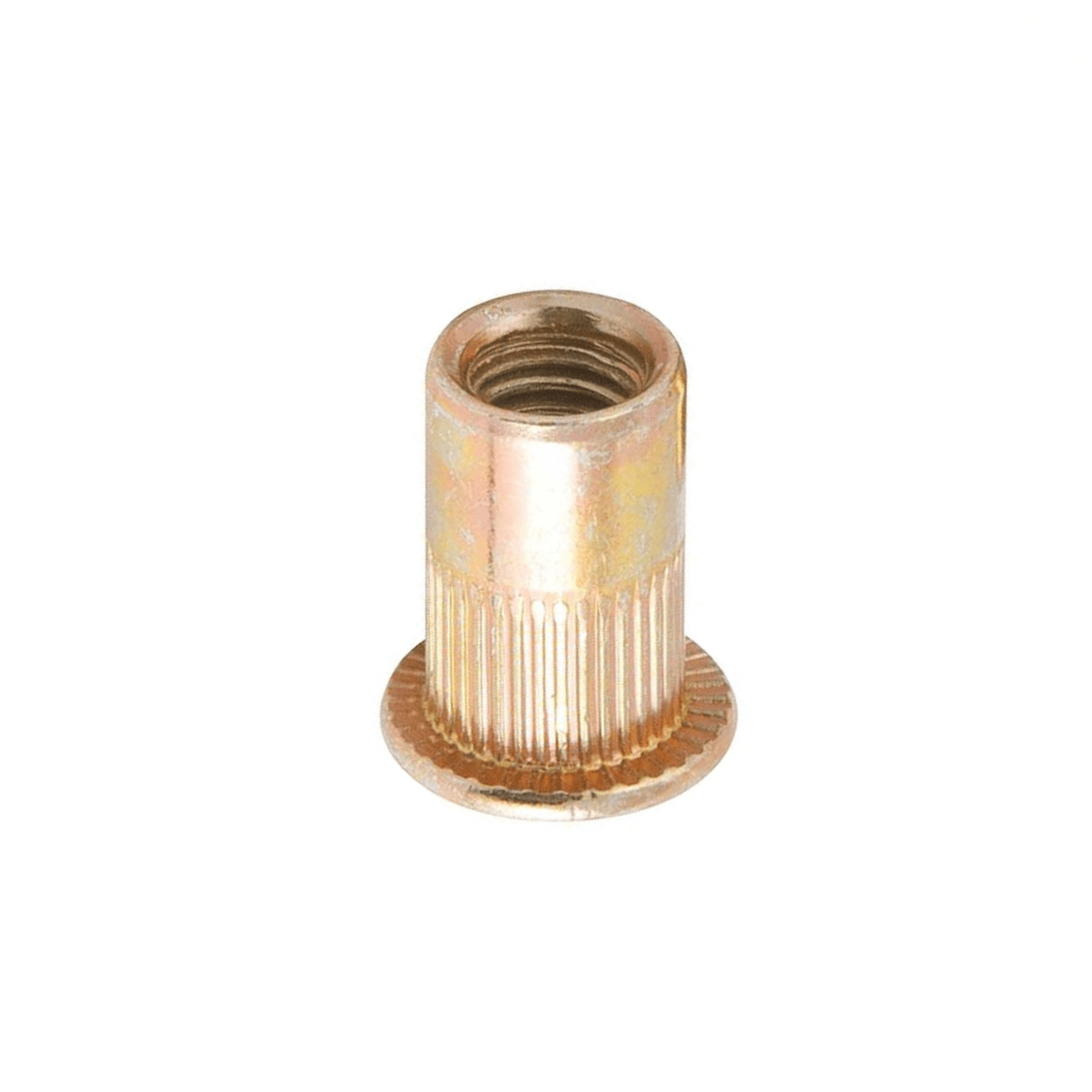 O rebite roscado de corpo cilíndrico recartilhado e cabeça plana alia alto desempenho mecânico com um bom acabamento.