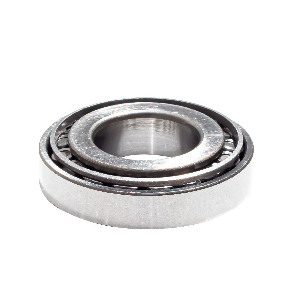 Os rolamentos de rolos cônicos têm pistas de anel interno e externo cônicas e rolos cônicos. Eles são adequados para suportar cargas combinadas, ou seja, cargas axiais e radiais atuando simultaneamente. As linhas de projeção das pistas se encontram em um ponto comum no eixo do rolamento para proporcionar uma ação de rolagem verdadeira e, portanto, poucos momentos de atrito durante a operação. A capacidade de carga axial dos rolamentos de rolos cônicos aumenta com ângulo de contato crescente a. O tamanho do ângulo de contato, que normalmente é entre 10° e 30°, está relacionado ao fator de cálculo e quanto maior o valor de e, maior será o ângulo de contato.