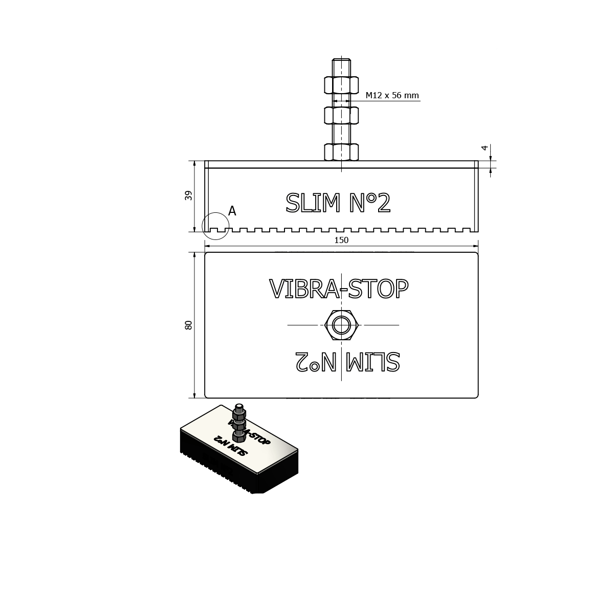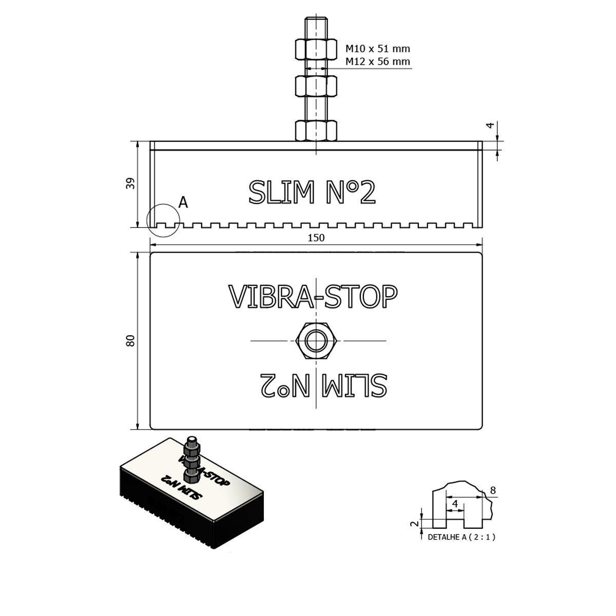 A Linha Slim contém design original que permite a instalação dos amortecedores em locais com limitações de altura. Sua base retangular oferece mais estabilidade para o equipamento, além de apresentar ranhuras que evitam deslocamento da base do amortecedor. A chapa metálica na superfície do amortecedor aumenta sua resistência mecânica e protege a borracha.