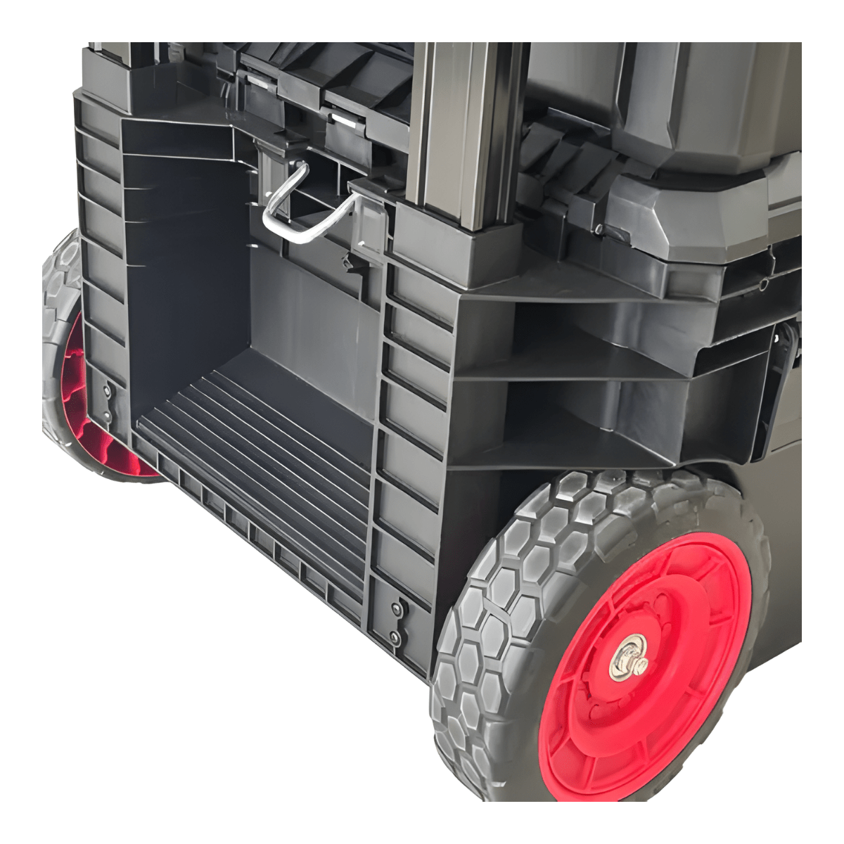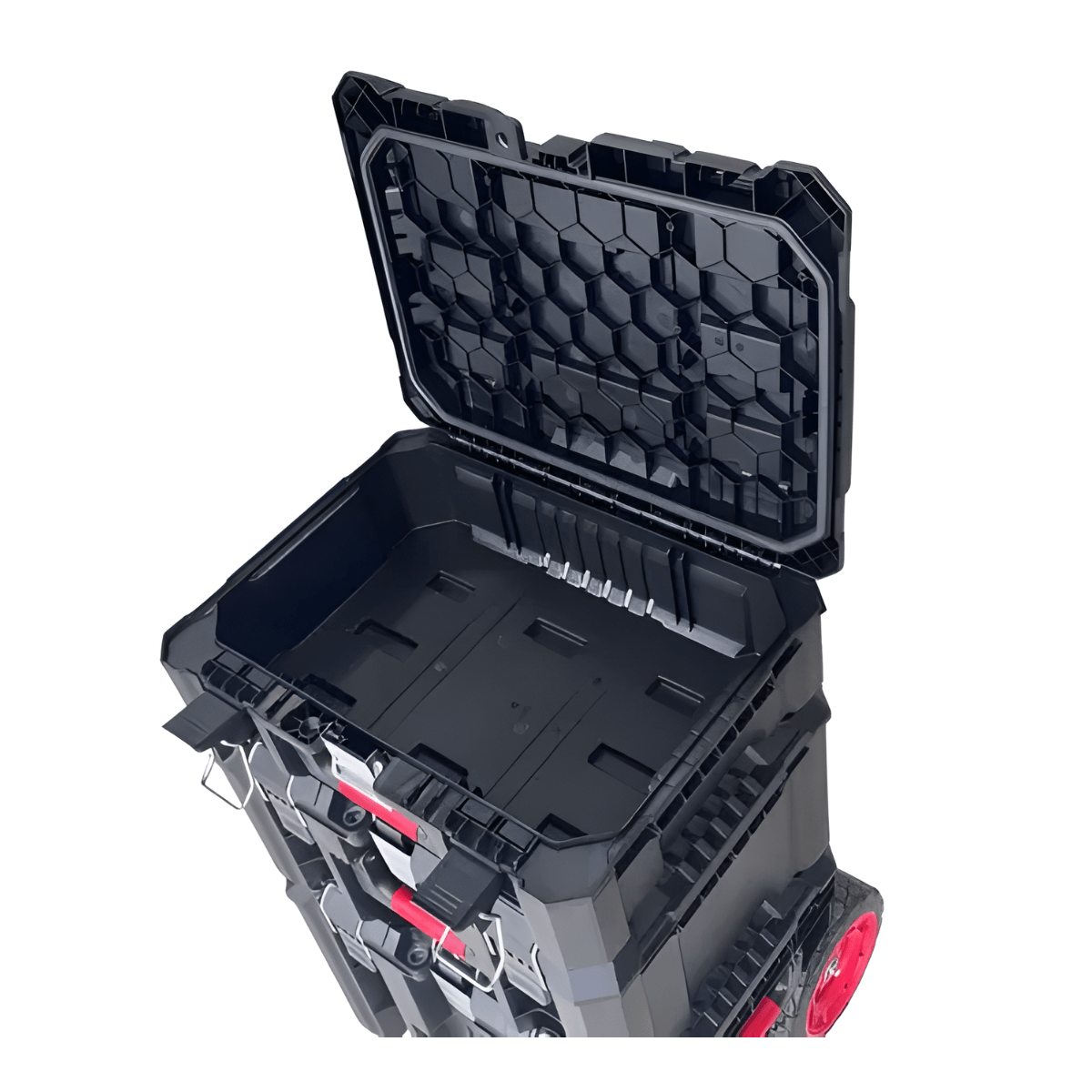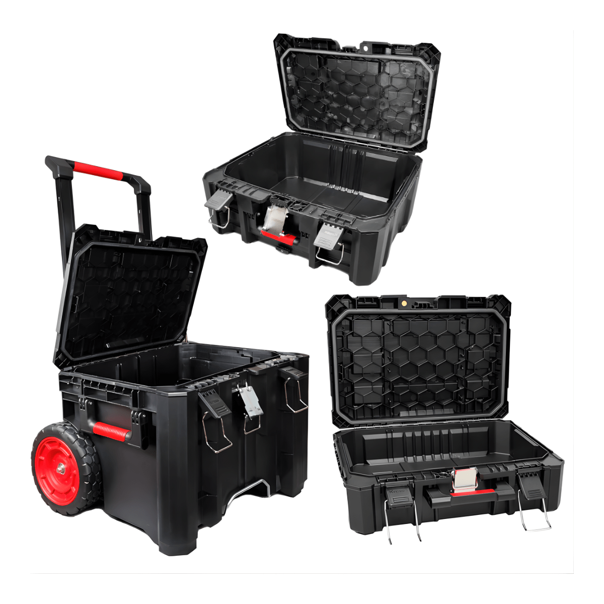 O sistema empilhável com rodas grandes de 9 e alça ergonômica proporciona mobilidade sem esforço, enquanto a construção resistente garante durabilidade excepcional e proteção contra poeira e respingos dágua com classificação IP65.